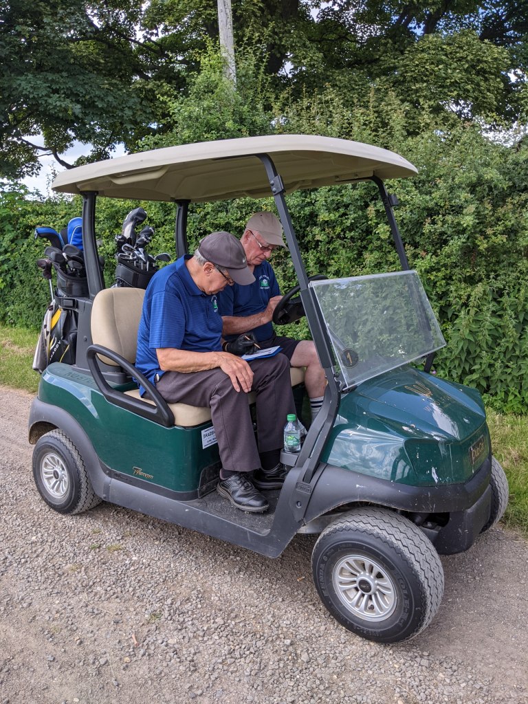The course was unusual. The rough was not vertical it was horizontal but we still lost balls in the hay. We were not disturbed by green keepers but by a haymaking tractor.